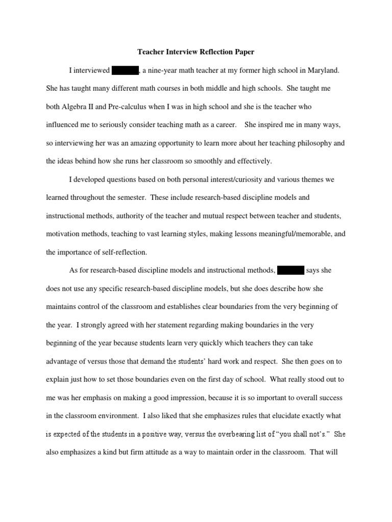 My goal with this reflection paper is to examine areas of my practice that need improvement, identify my strengths and purposeful consider ways that i can from the very opening statement, my goal was to build…show more content… the first example of empathy that i used (in the interview) was when. Reflection papers allow you to communicate with your instructor about how a specific article, lesson, lecture, or experience shapes your understanding as another example, if reflecting on a new social experience for a sociology class, you could relate that experience to specific ideas or social patterns. The organization of a reflection essay is not very different from the other essay types. How to write a reflective paper? For me, conducting and taking part in interviews has always been a stressful affair.